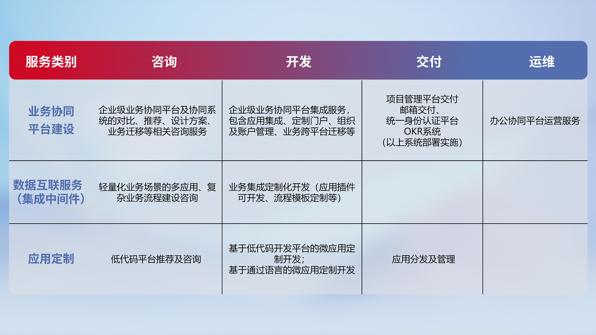 针对钉钉、、企微、、IDaas等平台级产品提供产品的规划、、方案、、、交付、、、、定制化开发等服务,,,,实现如统一协同办公、、、、智能客户服务、、、、混合会议管理、、、智能数据查询、、、等业务场景,,,实现数字化转型。。