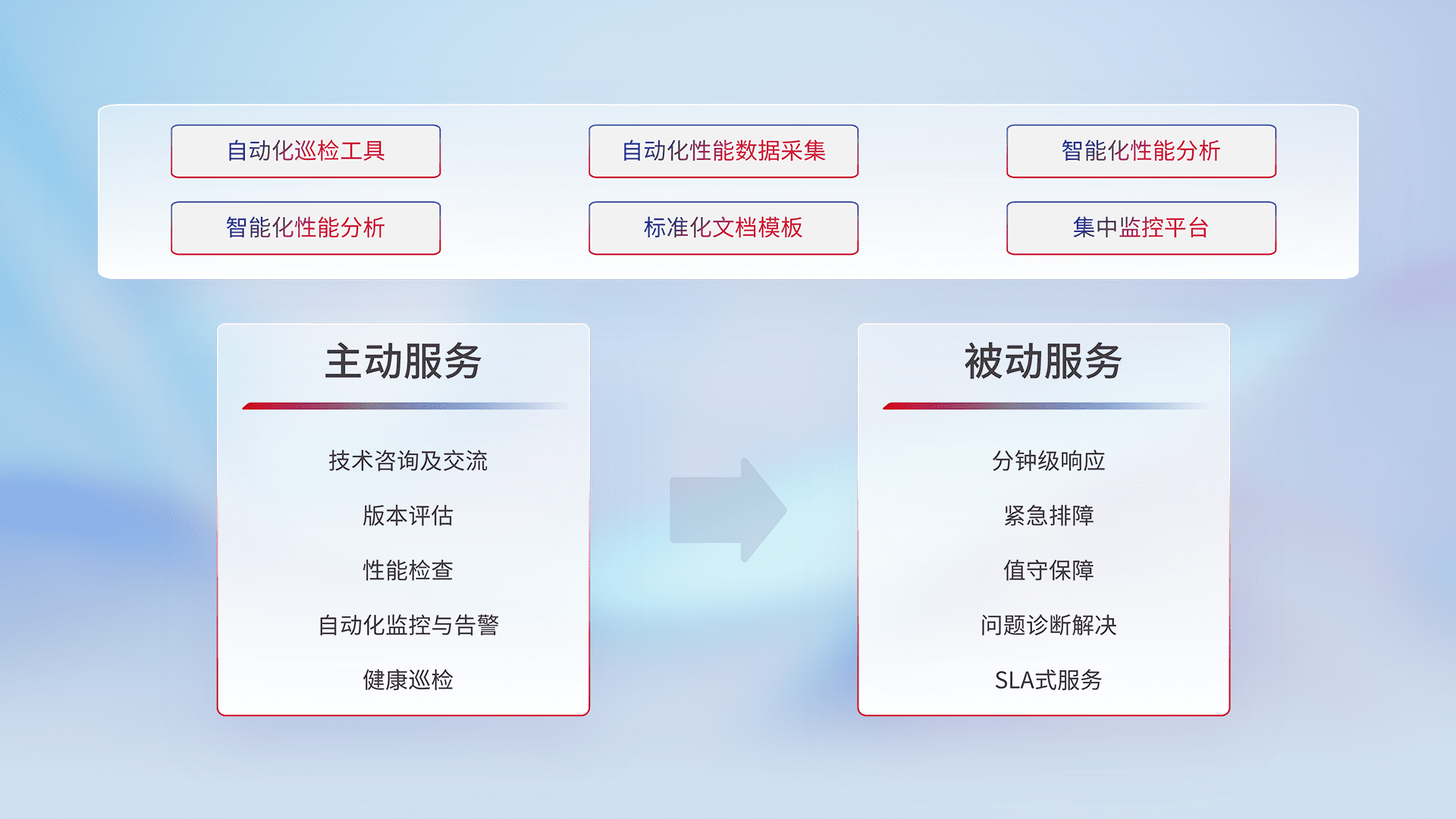 智能化工具和标准化文档,,保障服务质量,,,提供主动服务(包含技术咨询、、版本评估、、性能检查、、自动化监控与告警、、、健康巡检)和被动服务包含(分钟级响应、、、、紧急排障、、、、值守保障、、问题诊断解决、、、SLA服务)。。。